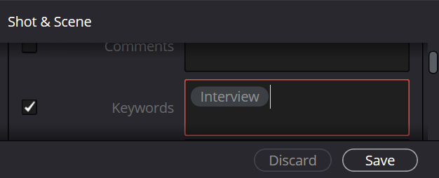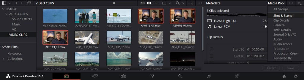 For any video clips, I can sort them by keywords using the metadata from the clips. Next to the three dots, there is a button with three lines and a downwards arrow. I clicked this to bring a list of groups and selected “Shot & Scene”. In the Metadata section, a list is shown and one of the options is the keywords. For three example clips, I keyworded them as “Interview” so then it will appear in Smart Bins in the keywords section. I can repeat this to sort different video clips by keywords.
