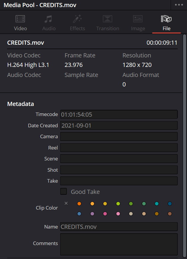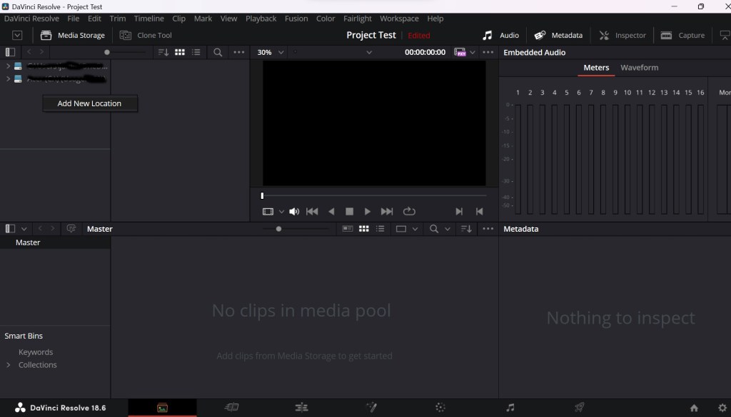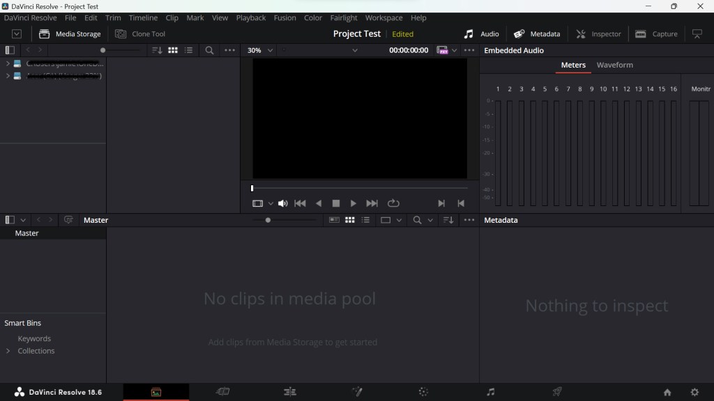 Media: First, I learned that the location of my system storage is in the top left corner of the media tab in DaVinci Resolve where I can access files.