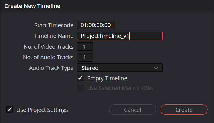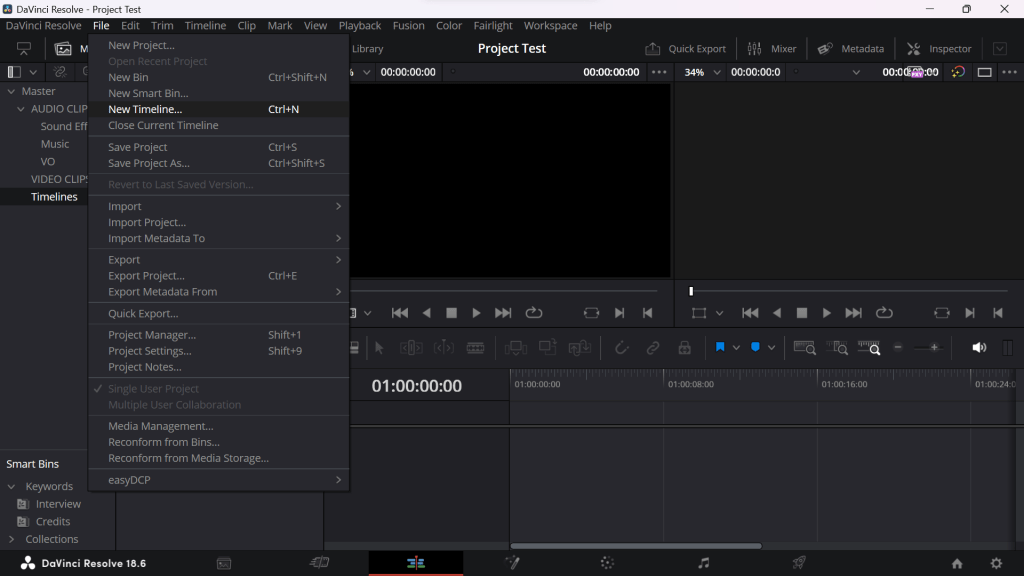 Editing: I created a new bin for timelines so I can assemble the video and audio clips. In this new bin, I created a new timeline by going into File -> New Timeline. In the project settings, I can change the frame rate for the project. However, this has been done already and has been checked by default.