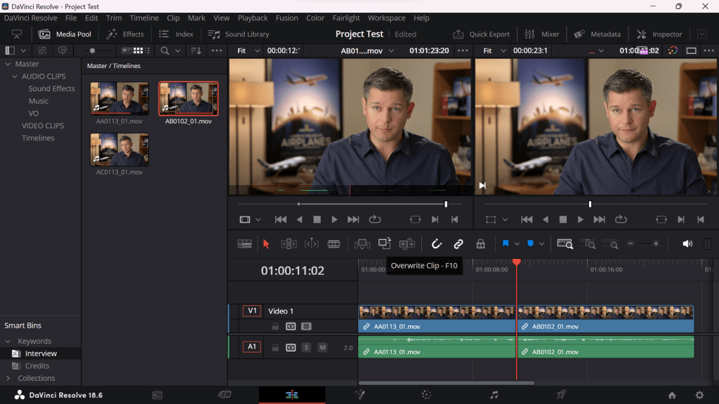With the interview clips provided from the tutorial, I moved the first clip from the first panel to the second panel which by default gives the option to overwrite which makes it easier to edit the clip rather than simply dragging and dropping it into the timeline since that way of editing is limited.