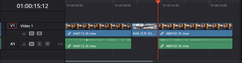 Since the first two clips are close together, I repeated the process of cutting out parts of another clip by pressing the I and O key, and instead of overwriting the clip on the timeline, I inserted the new clip in between the interview clips.