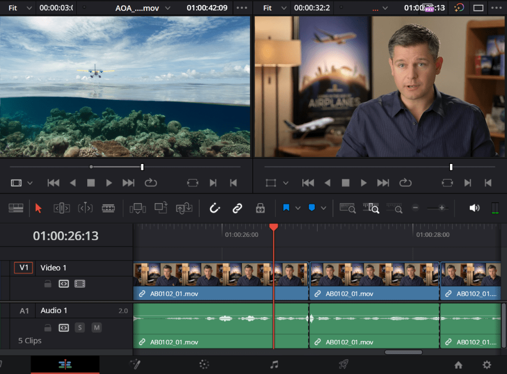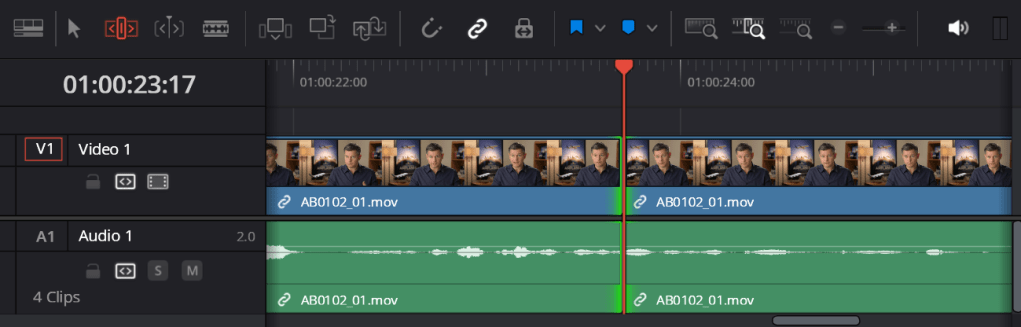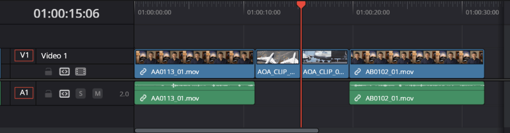 For the music, I placed this on top of the timeline (in reality it goes below the first audio track) rather than inserting it or overwriting it in the timeline. As for the cut from before, I can overwrite it with a different clip so the transition is better which works with the edited audio from the interview.