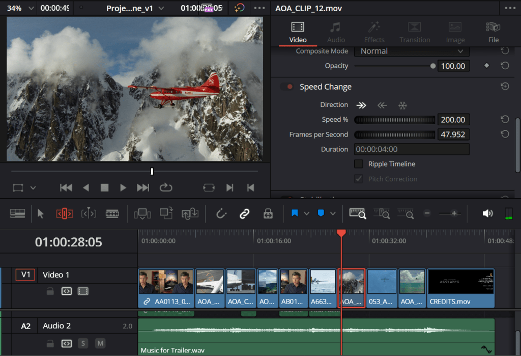 To change the speed of a video clip, click Inspector and scroll down until there is “Speed Change” in the list. Since there was barely any movement in this clip, the percentage was changed to 200% rather than 100%.