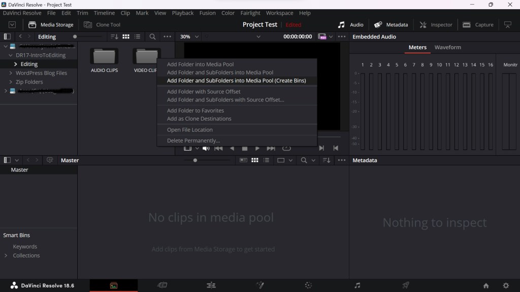 To do this, I highlighted the folders of clips that I want to add into the media pool (in this case, the clips in the audio and video clips are examples to help me learn the first part of the editing process), then right click and select “Add Folder and Sub Folders into Media Pool (Create Bins)”.
