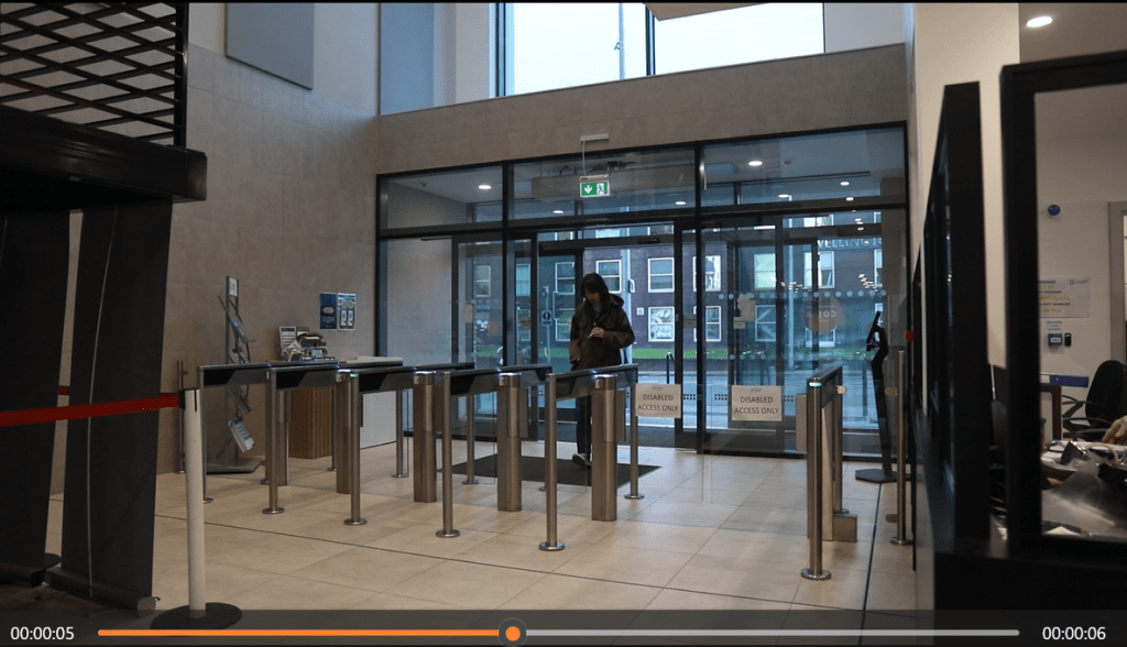 There are also footage that has been filmed at different distances or angles so for this one, I edited the footage from where Oliver has stepped on the carpet so I can cut to a close up shot to where he can place his lanyard on this gate to let himself in. After he leaves this shot, it cuts back to where the first shot was.