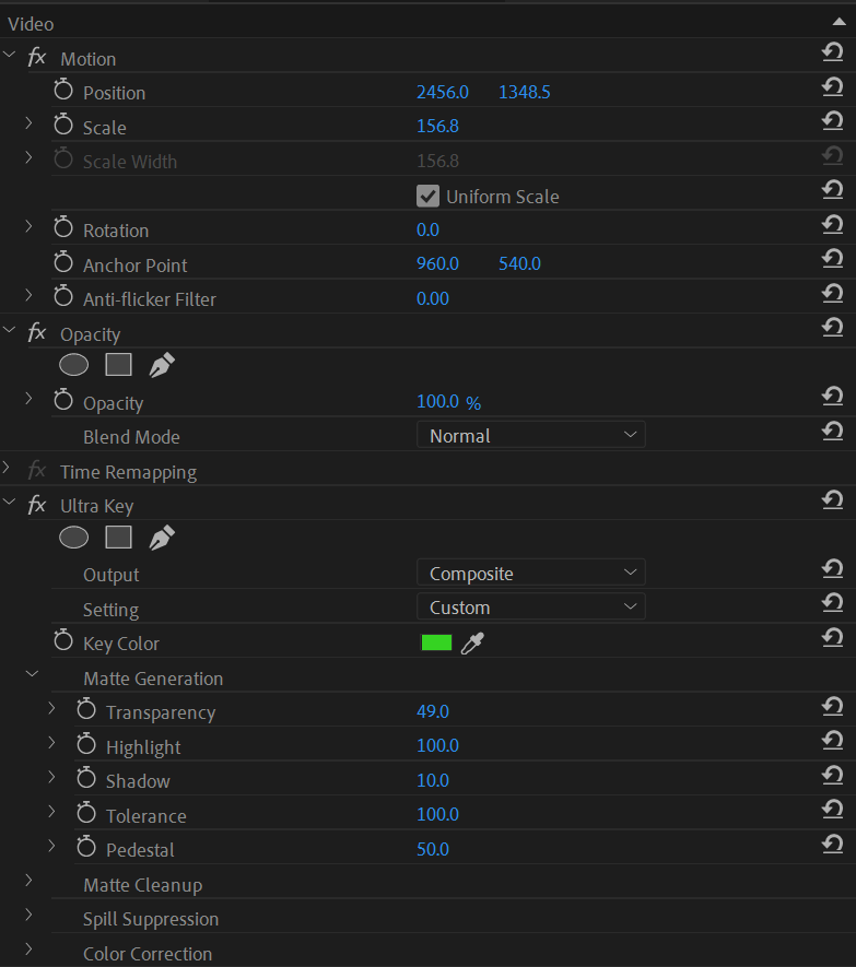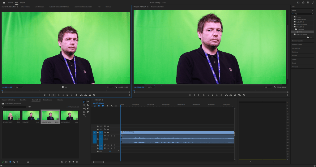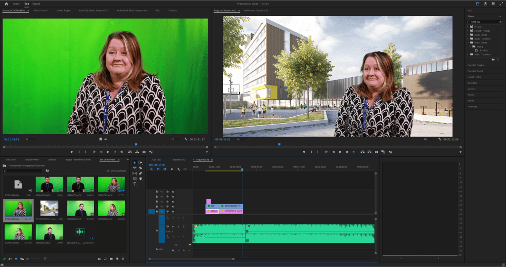 For the interviews, I can edit out the green screen using an keying effect called Ultra Key which allows me to use click on the green screen, remove the colour of the background and replace it with a more interesting background.