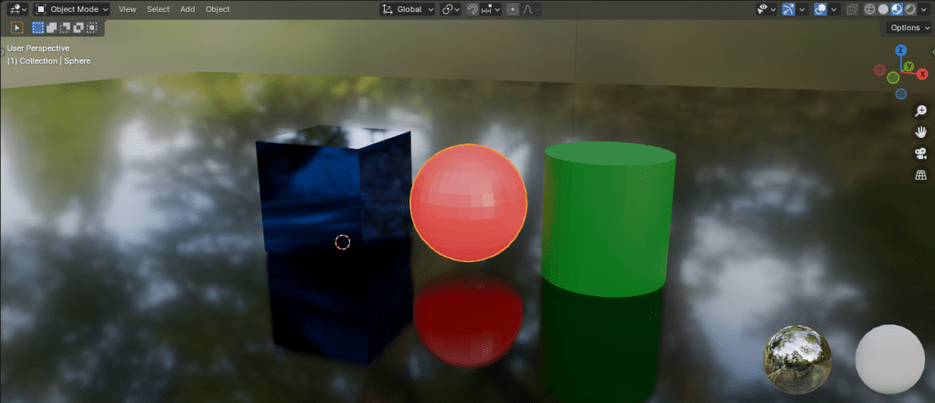 I experimented with creating basic materials in Blender by switching from the Layout workspace to the Shading workspace and changing the basic colour such as red and green.