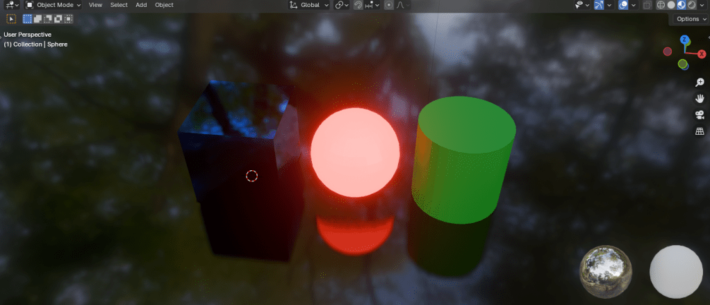 I added emissive colour to the rest of the shapes I have placed in the scene and this is the result of it when using the “cycle” render engine instead of the Eevee render engine.