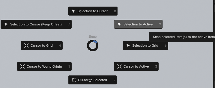 - Shift + S – creates a pop up that allows you to move your cursor to the world origin or objects