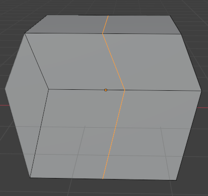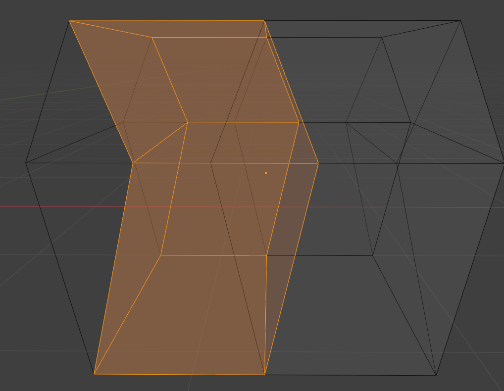 I created loop cuts using the keyboard shortcut Ctrl + R (one horizontally and one vertically) and moved one side of the face of the cube outwards using G and X keys to create part of the character’s torso. I used the wireframes to select half of the cube (highlighted in orange) and deleted only the faces which results in creating a gap in between.
