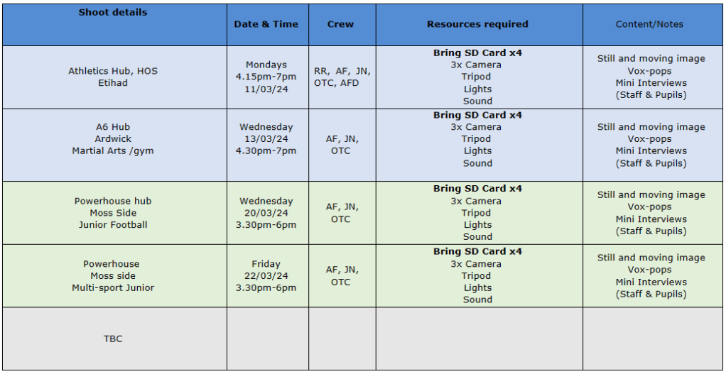 On Monday 4th March, myself and the rest of the class had a meeting with our client and we asked production questions to do with the colour scheme of Stride’s brand (whether to keep it as it is or change it), where we can film mini interviews and vox pops, what is the clients’ expectations, etc. Afterwards, we took the information we needed and my tutor organised the production schedule for us as to which places we are going to film, what time we have to get there for, who will be travelling to the locations and what resources we have to borrow so that we can successfully begin filming. The schedule that we are following can be seen below: