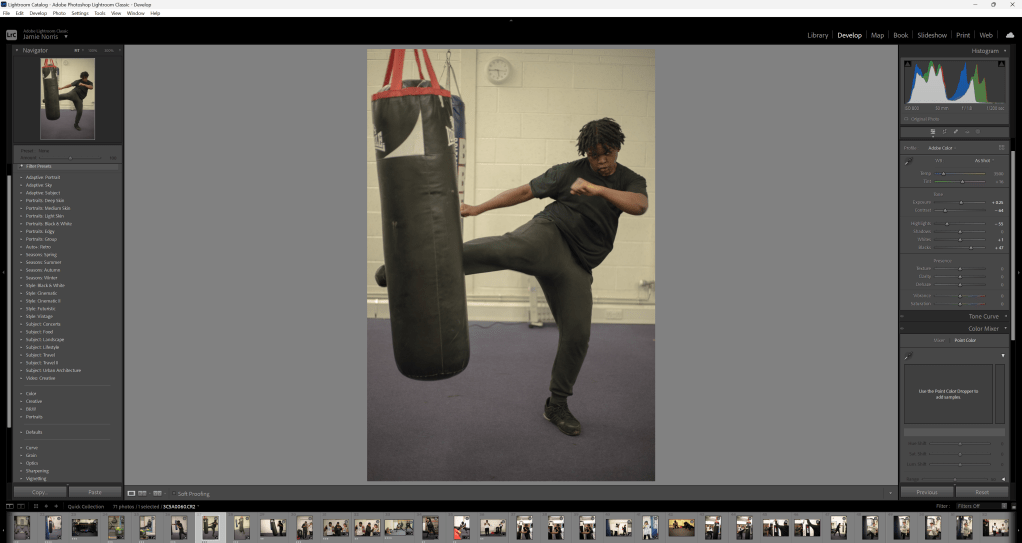 In Lightroom, I followed a similar process by sorting the photographs into groups as which ones will be used for editing and which ones will be discarded. After, I fixed the photographs by eliminating shadows and turning up the brightness in the photographs by experimenting with the settings so that the photograph isn’t yellowish or dark. This is repeated for the rest of the photographs that are useable including an example below: