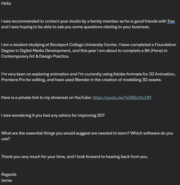 I created a draft email of what I could send to the co-founder of YOYOPOP (Trev), featuring simple questions and a showreel of my best projects since I had never been in touch with creators in the animation industry before. I reviewed what I had written with family members and my tutor before getting the thumbs up to send it off.